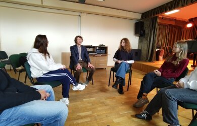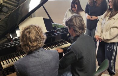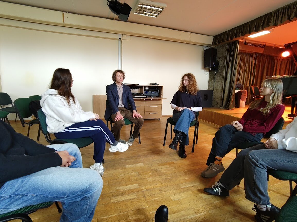 Po koncerto Giedrius pristatė gimnazistams muzikanto profesiją ir papasakojo, kaip gimsta muzika. Jis dalijosi patirtimi, kad pirmiausia svarbu daug klausytis muzikos, mėginti atkartoti tai, kas patinka, o vėliau pamažu eksperimentuoti ir pridėti kažką savito. Taip gimsta originalūs kūriniai.